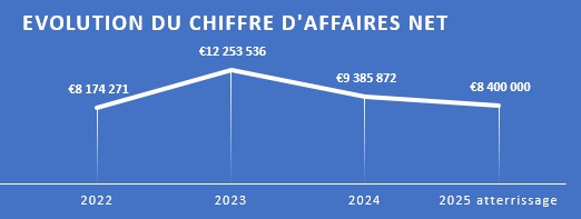 L’entreprise a réalisé un chiffre d’affaires de 9,27 M€ en 2024, ce qui témoigne d’un volume d’activité important malgré le recul observé par rapport à l’exercice précédent. La baisse de la rentabilité enregistrée sur l’exercice s’explique en grande partie par un coût exceptionnel de restructuration d’environ 200 k€, lié à un licenciement intervenu dans le cadre d’une réorganisation interne. Cet élément est par nature non récurrent et ne devrait pas se reproduire sur les prochains exercices.