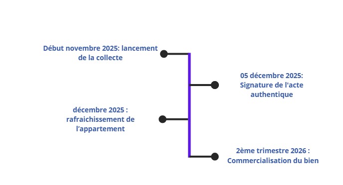 Un délai sera nécessaire entre la collecte des fonds et la mise en place de l'hypothèque. La mise en place du financement interviendra avant la fin du mois de Juillet et la première échéance de ce projet sera probablement fixée le 05/09/2025.