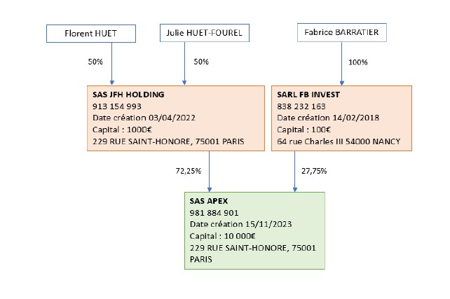 La SAS APEX est détenue à 72.5% par SAS JFH HOLDING (SIREN 913154993) et à 27.5% par SARL FB INVEST (SIREN 838232163)