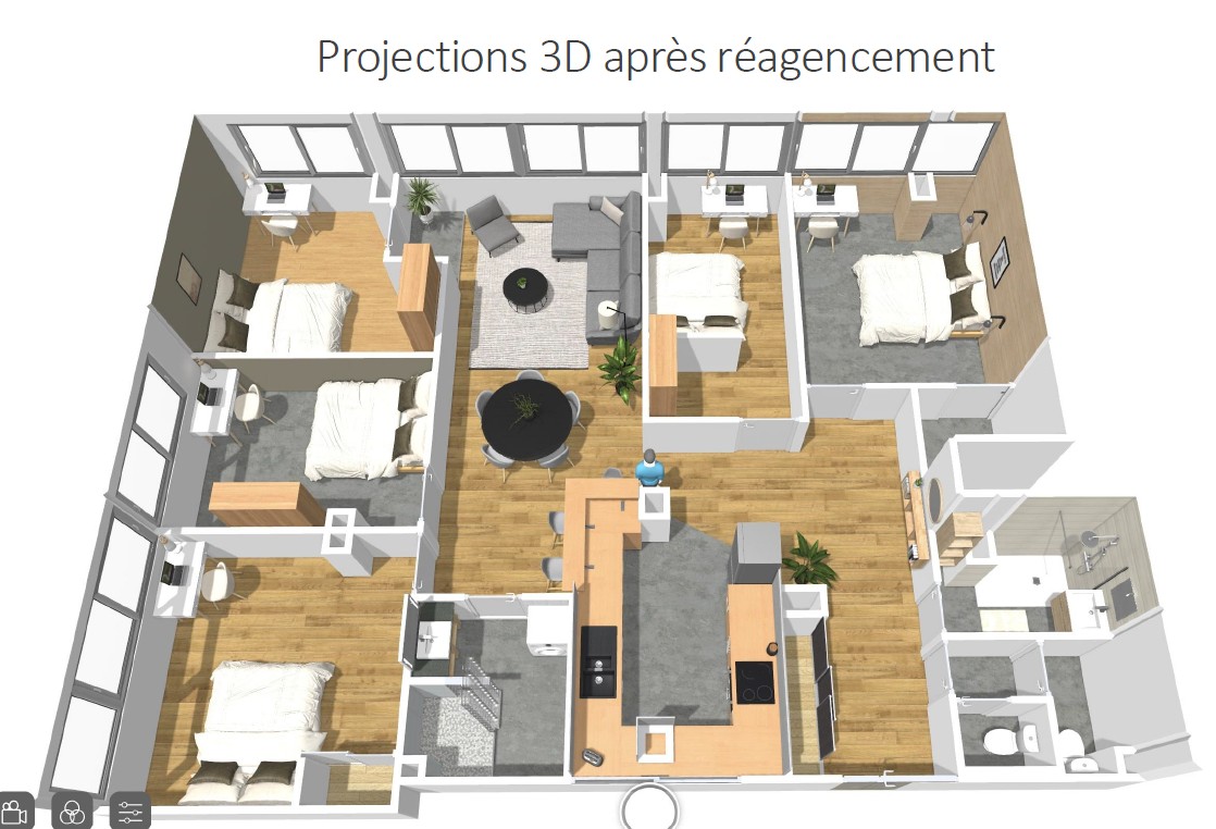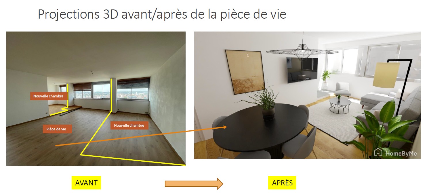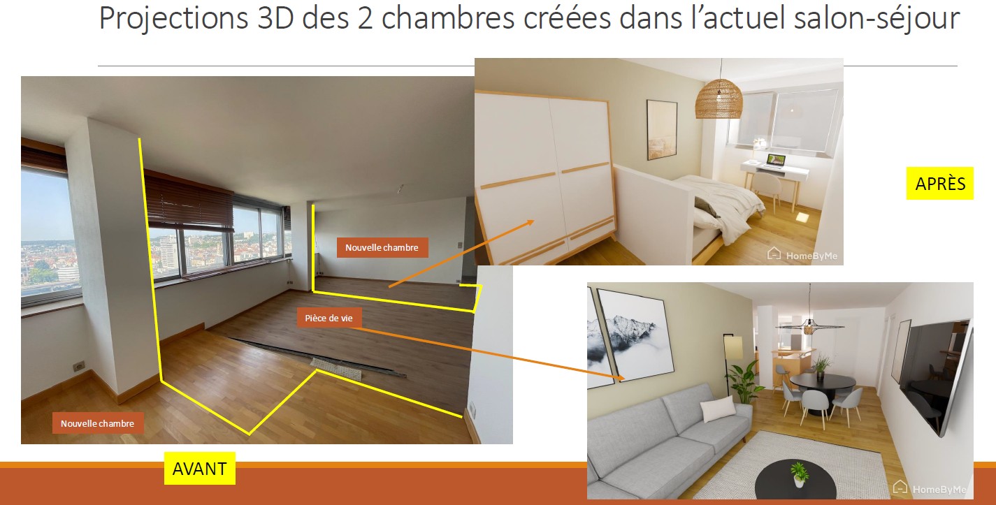 -Création de 2 chambres de 10 à 11m2 dans l’actuel salon-séjour, chacune bénéficiant d’une belle luminosité et d’une vue imprenable sur la ville de Nancy du fait de leurs grandes ouvertures.
