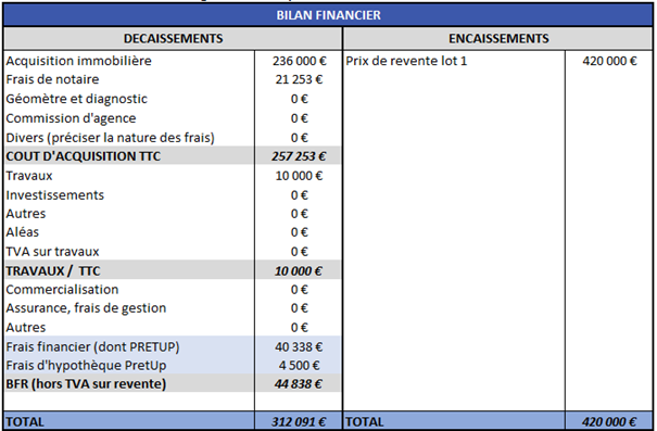 La société réalise un apport initial de 51K€ et couvrira les mensualités du financement PretUp jusqu’à la vente définitive du bien (ci-dessus estimés à 25.6K€ dans l’hypothèse d’une vente dans un horizon de 12 mois).