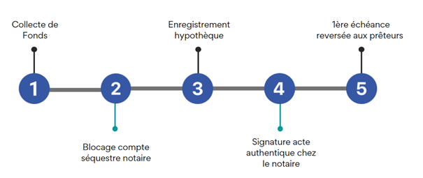 Un délai sera nécessaire entre la collecte des fonds et la signature de l’acte authentique chez le notaire et la mise en place de l'hypothèque. La mise en place du financement interviendra fin janvier / début février 2026. La première échéance de ce projet sera probablement fixée le 05 mars 2026.