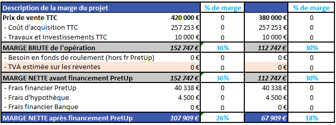 Le prix cible étant positionné légèrement au-dessus des standards du marché, nous avons également estimé la marge dans l’hypothèse d’un prix de vente moins favorable (380K€). Dans ce contexte, la marge nette après financement PretUp ressort à 68K€ soit 18% du montant de l’opération.
