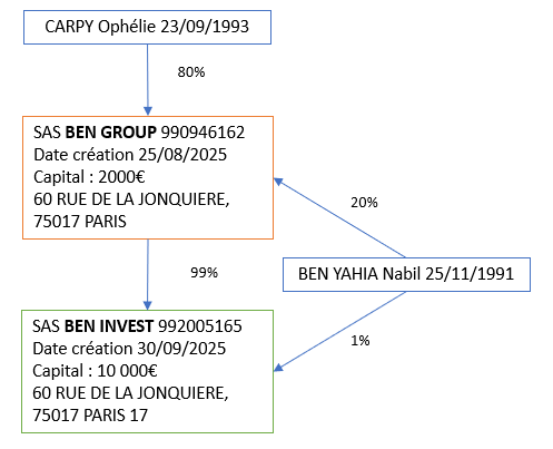 La société BEN INVEST (992005165) a été créée en 09/2025 par Monsieur BEN YAHIA e Madame CARPY afin de réaliser des opérations de marchand de biens en région Ile de France. Elle est détenue par la holding BEN GROUP (990946162), récemment créée également, et par Monsieur BEN YAHIA (Président) en direct.
