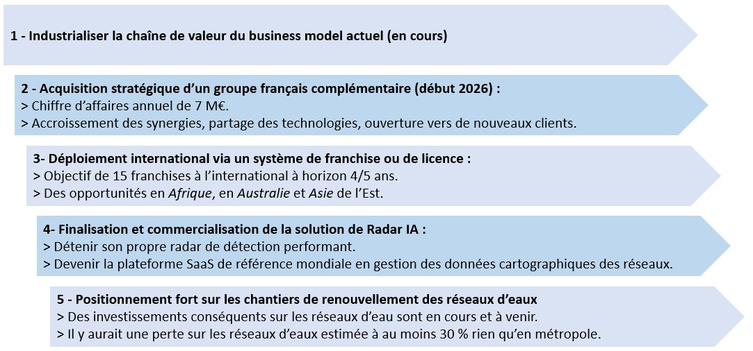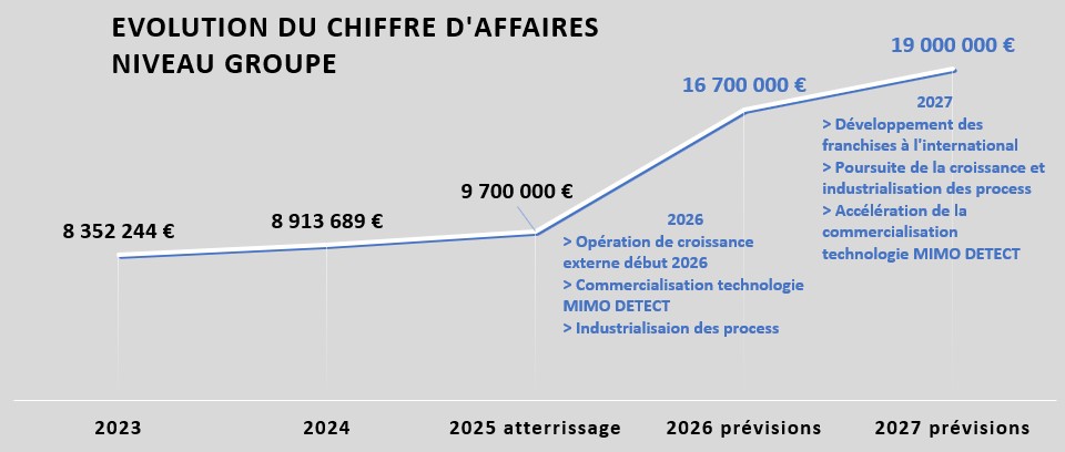> En 2026, la réalisation de l’opération de croissance externe devrait permettre une hausse d’au moins 6 M€. La mise en commercialisation de la technologie MIMO DETECT, l’industrialisation des process internes et l’ouverture de nouvelles franchises compléteront cette hausse.