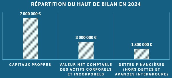 Au 31/12/2024, les capitaux propres au niveau du groupe sont d’environ 7 M€. Les actifs immobilisés corporels et corporels ont une valeur net comptable de 3 M€.