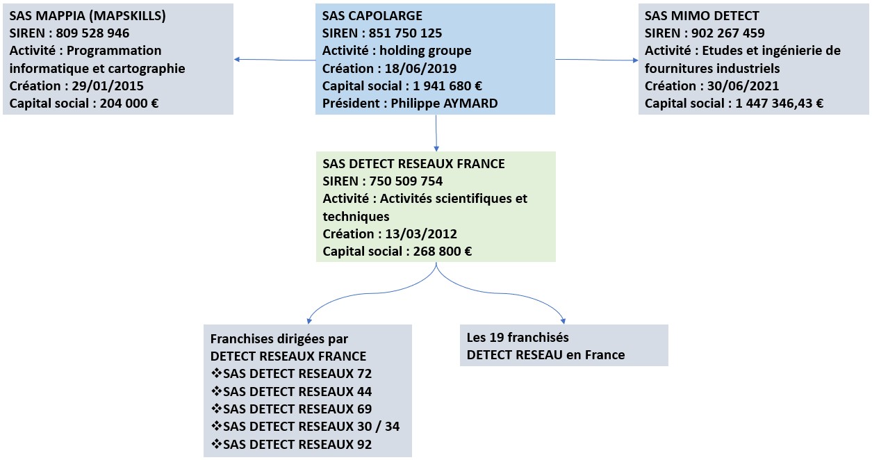 La SAS CAPOLARGE (SIREN : 851 750 125) est la société mère du Groupe DETECT RESEAU fondé par Monsieur Philippe AYMARD en 2009. Le Groupe est le leader de la détection intelligente des réseaux enterrés. Elle propose ses services à tous les acteurs de travaux publics, des concessionnaires, des industriels et collectivités territoriales.