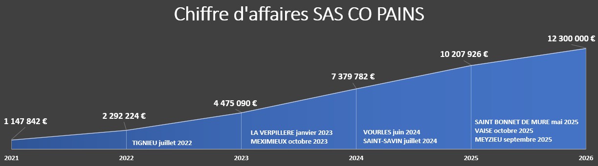 Au 31/12/2024, la SAS CO PAINS a réalisé un chiffre d’affaires de 7,4 M€. Les données comptables 2025 font ressortir un chiffre d’affaires en hausse de 38 %, soit un atterrissage à 10,2 M€. En 2026, le niveau d’activité devrait continuer à grimper pour atteindre 12,3 M€. Les 3 boulangeries acquises courant 2025 donneront une activité pleine sur l’exercice 2026.
