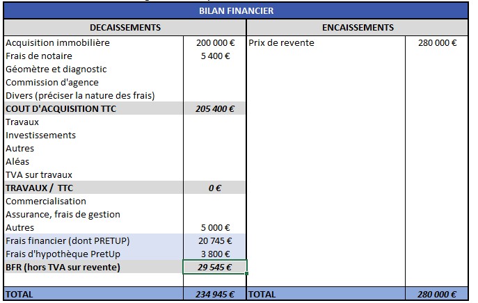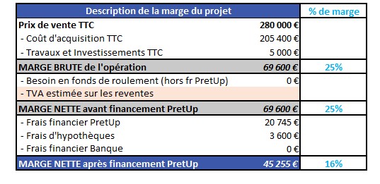 La marge dégagée sur cette opération après financement PretUp sera de l'ordre de 45k€ soit 16%.