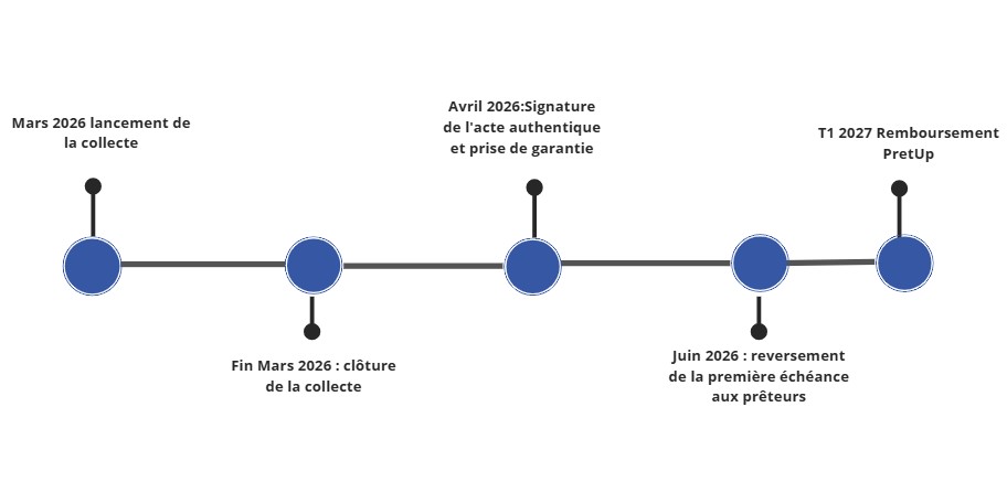 Un délai sera nécessaire entre la collecte des fonds et la signature de l’acte authentique chez le notaire et la mise en place de l'hypothèque. La mise en place du financement interviendra d'ici la fin du mois d'avril. La première échéance de ce projet sera probablement fixée le 05/05/2026