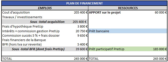 La société SAS DELARD autofinance 60k€ ; soit 25% du projet global. PretUp finance 185k€ soit 75% du plan de financement.