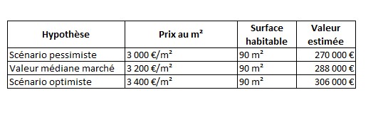 Le scénario pessimiste retient un prix de 3 000 €/m², soit un niveau inférieur à la moyenne de marché observée autour de 3 200 €/m².