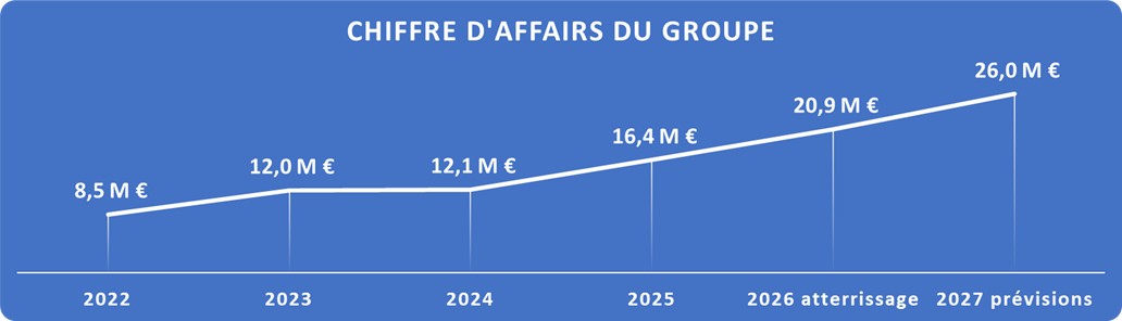 Le chiffre d’affaires Groupe a dépassé les 16 M€ de chiffre d’affaires en 2025. La croissance se poursuit puisque l’atterrissage du niveau d’activité pour 2026 est prévu à 20,9 M€ (à périmètre constant).