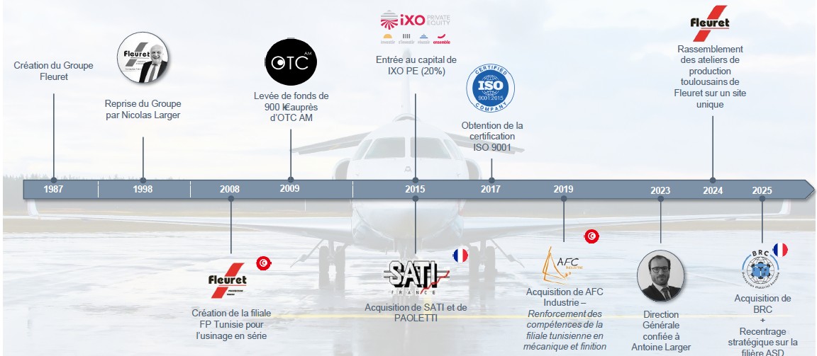 En 2025, le groupe fait l'acquisition de la société BRC (391 439 767), un acteur de référence auprès de la DGA (forte exposition au marché de la Défense avec 80% du CA). Ce projet a fait l'objet d'un financement PretUp de 210 k€ en mai 2025. Les synergies avec FLEURET sont très fortes : ventes croisées, accès à une clientèle du secteur de la Défense pour Fleuret, sous-traitance croisée sur certaines soudures, mutualisation de fonctions support, économies d'échelle sur les achats en matériaux composites. |