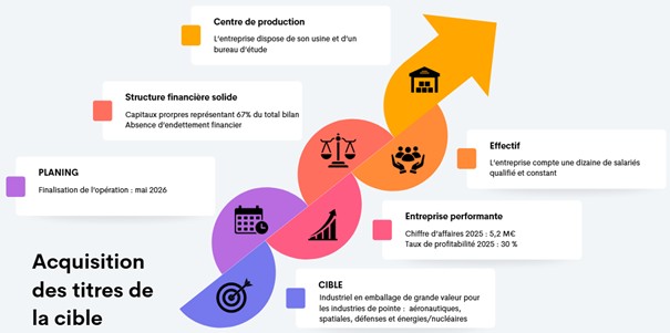 En 2026, les commandes concernant le secteur de la défense sont très élevées. Le groupe suit la cadence imposée. Le chiffre d’affaires 2026 augmentera naturellement sans l’opération en cours. La cible réalise en 2025 plus de 5 M€ de chiffre d’affaires. Toute chose égale par ailleurs, il est logiquement attendu un niveau identique en 2027, permettant au groupe d’entrevoir un chiffre d’affaires au-delà de 26 M€.
