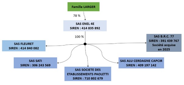 Monsieur Antoine LARGER, né en 1991, est le Président depuis 2023 de la société ENEL 4E. La famille LARGER détient 78 % des titres. La société holding détient l’intégralité des titres de ses filiales.