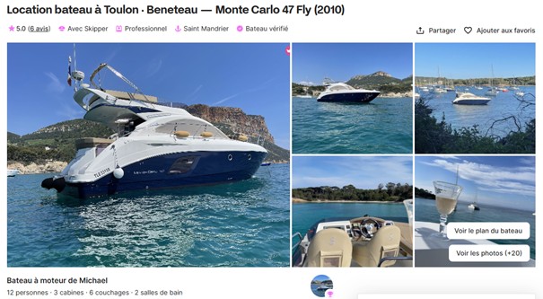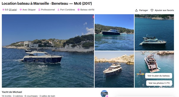 La société n’a pas de site internet. Vous pouvez retrouver des exemples d’annonces sur des sites spécialisés de location en ligne de bateau avec ou sans skipper.