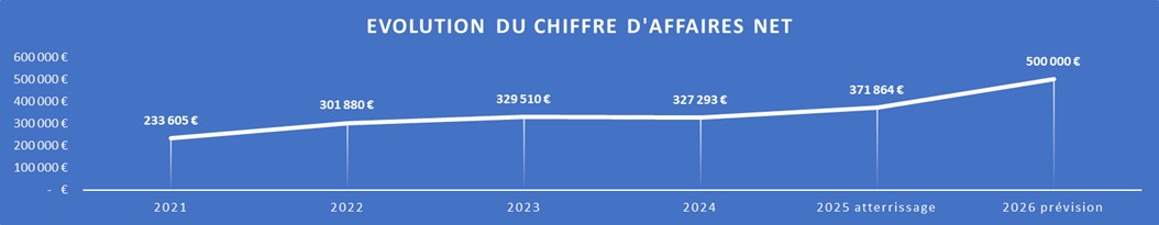 La société est en perpétuelle croissance depuis sa création. Au 31/12/2024, le chiffre d’affaires a atteint 327 k€. Pour l’exercice 2025, le chiffre d’affaires atteint sera de 372 k€ ; soit une hausse de 14 % en 1 an.