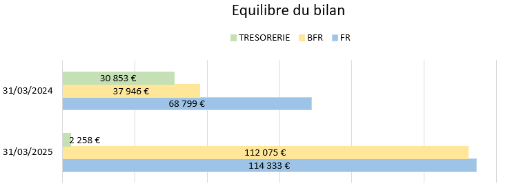 Au 31/03/2025, le Fonds de roulement et le BFR ont augmenté mais l'équilibre financier est respecté laissant apparaître une trésorerie nette de 2k€.