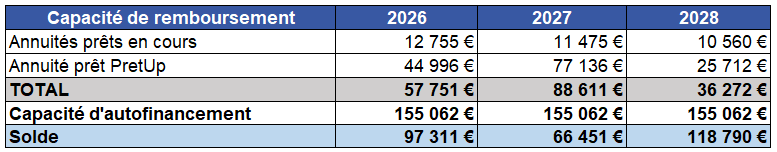 La CAF d'un montant de 155k€ sur 2025 permet à l'entreprise de rembourser ses annuités actuelles et celles de PretUp.